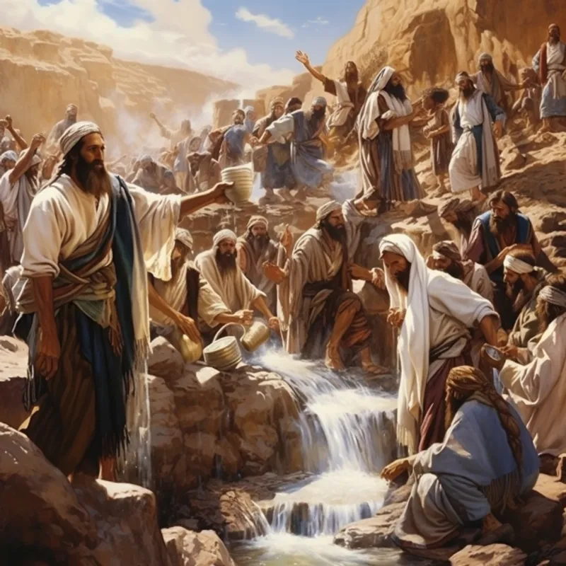 Израильтяне жалуются на отсутствие воды, и Бог предоставляет им воду из скалы.