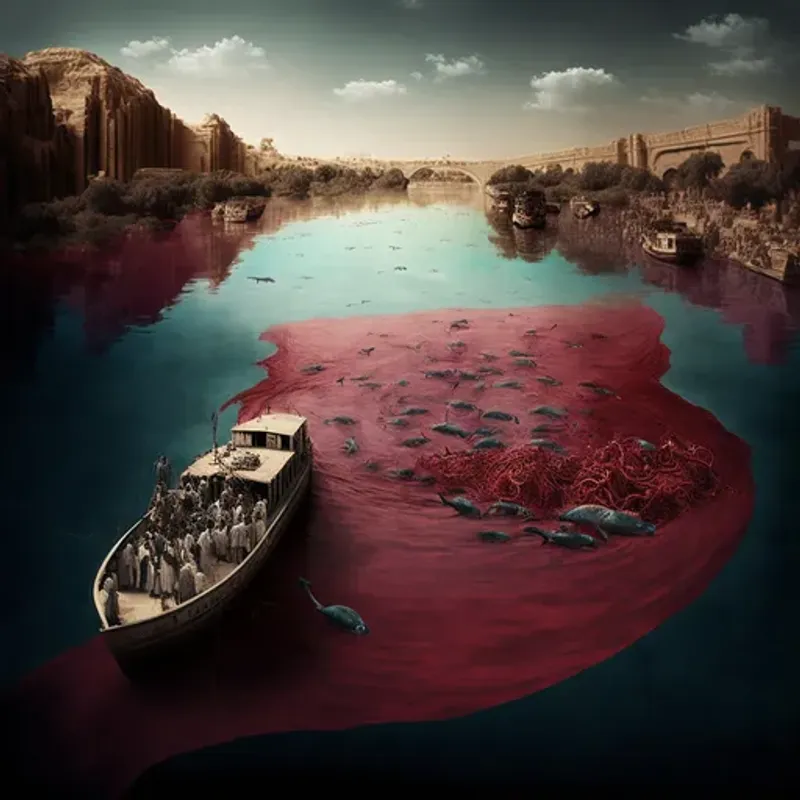 Исход 7:20 - И сделали Моисей и Аарон, как повелел Господь. И поднял Аарон жезл и ударил по воде речной пред глазами фараона и пред глазами рабов его, и вся вода в реке превратилась в кровь,